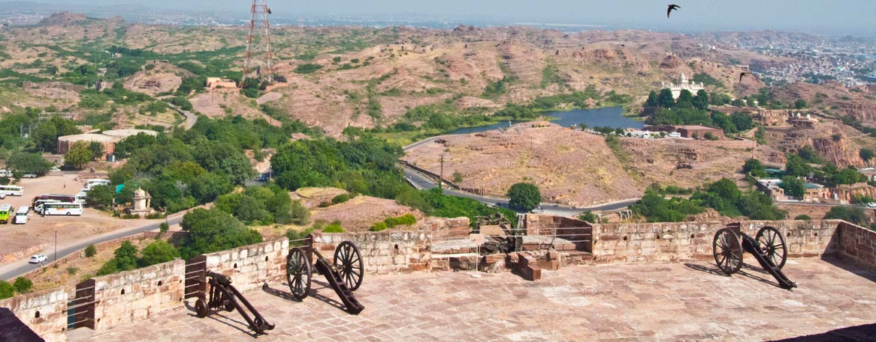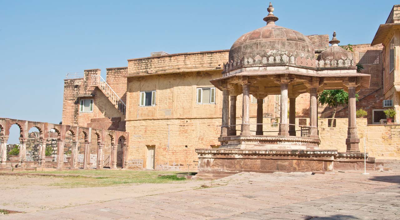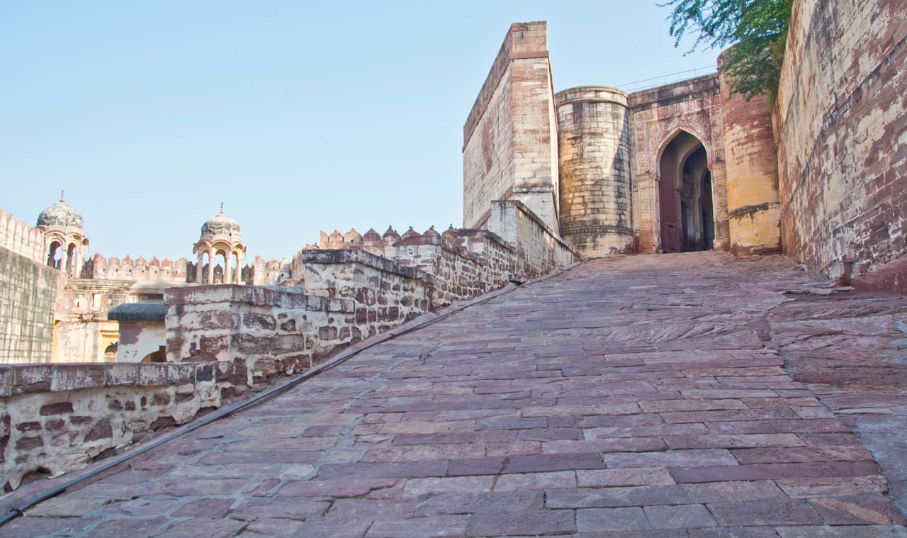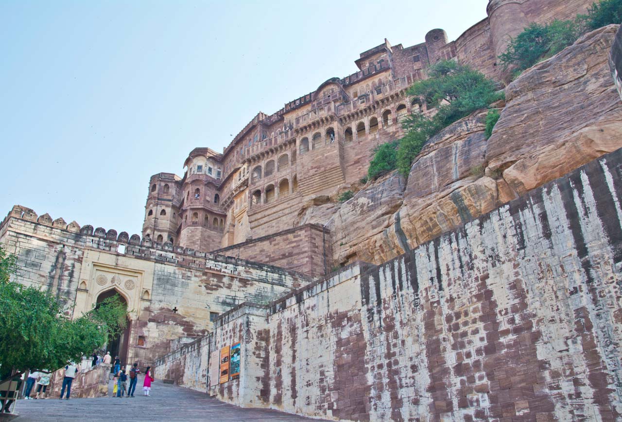 The Mehrangarh Fort stands on a 125 meter a perpendicular cliff and can be seen from far. It was built around 1460 by Rao Jodha above the city and is enclosed by imposing thick walls. A winding road leads to and from the city below. To the left of the fort is the chhatri of Kirat Singh Soda, a soldier who fell on the spot defending the Mehrangarh fort.