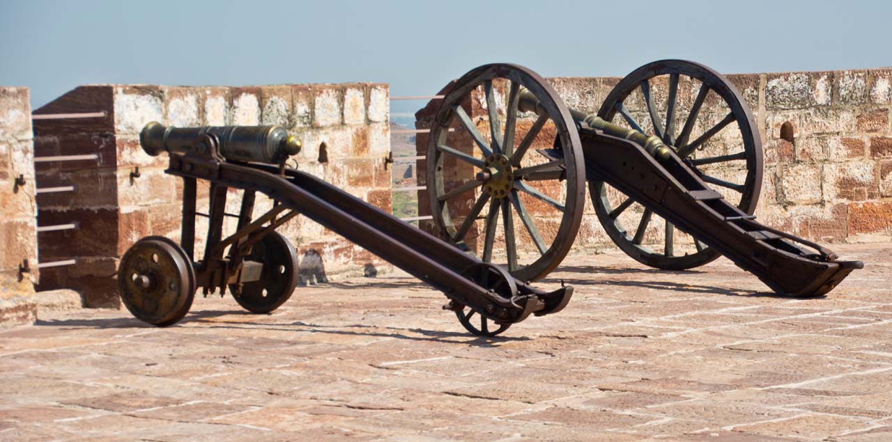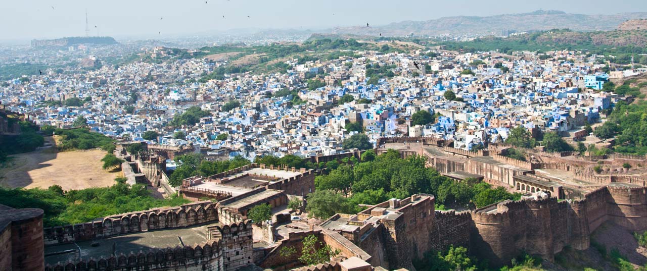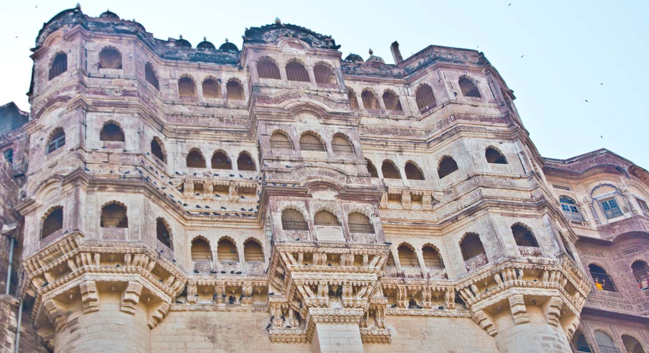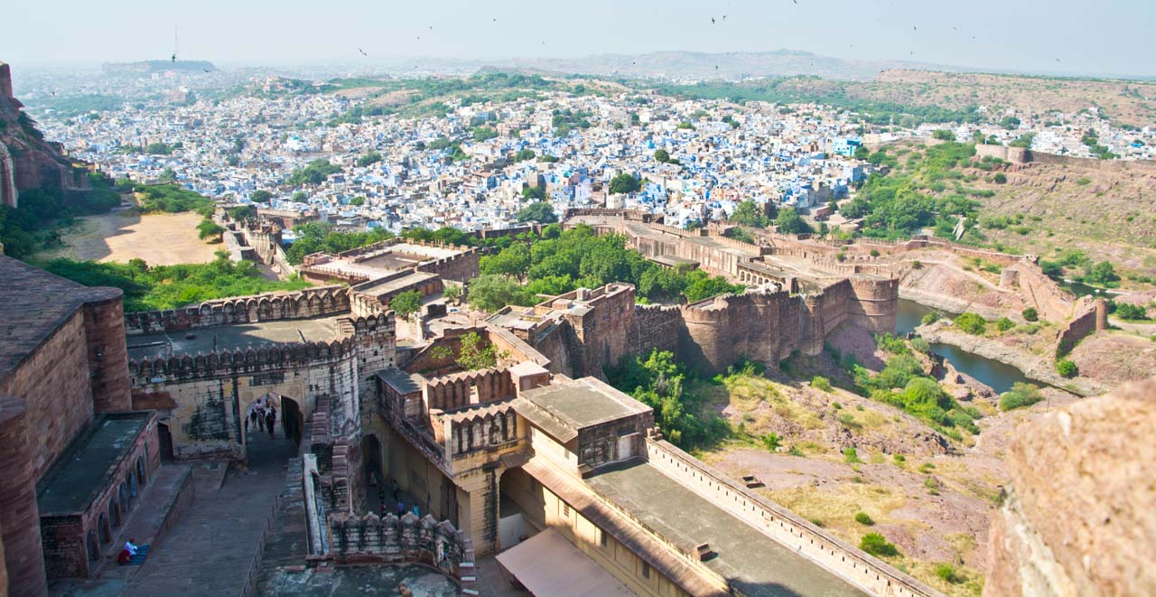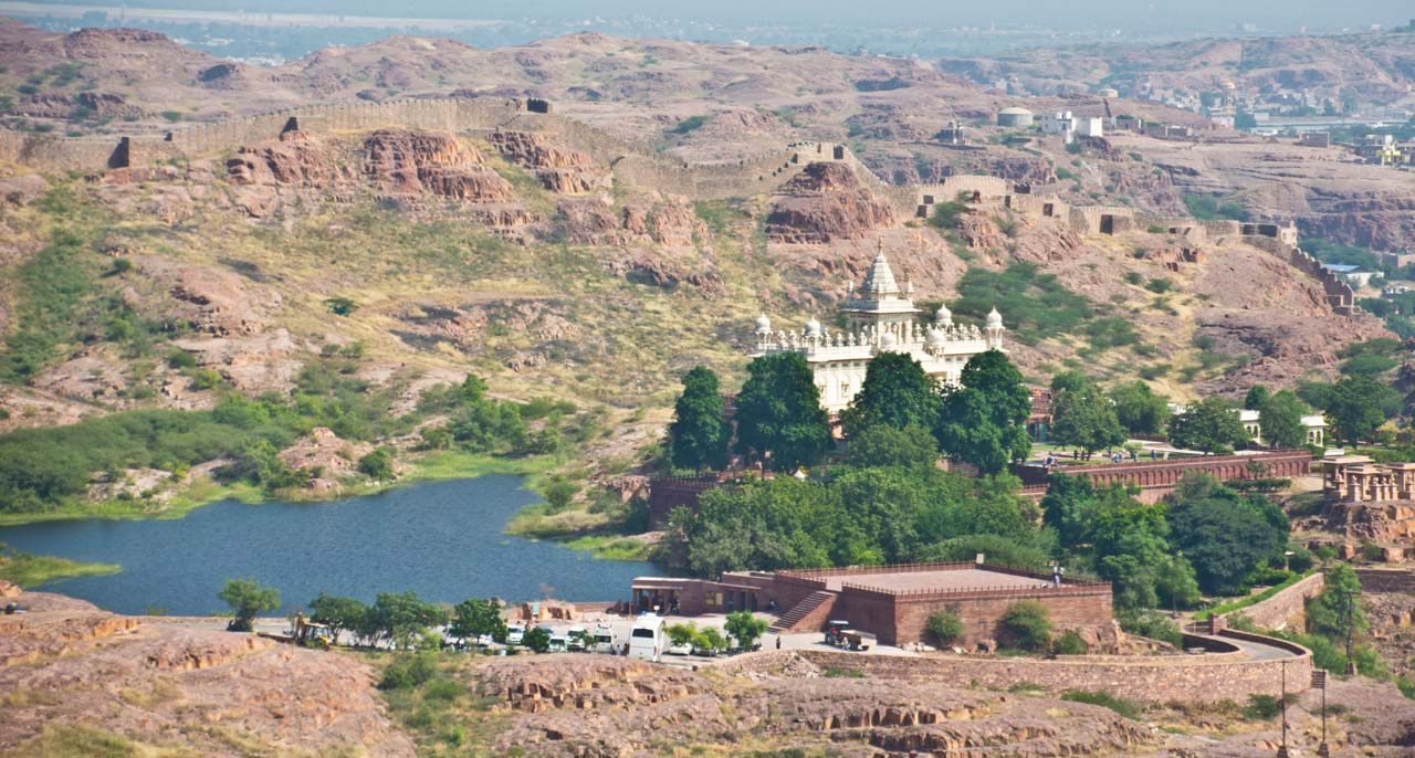 The Mehrangarh Fort stands on a 125 meter a perpendicular cliff and can be seen from far. It was built around 1460 by Rao Jodha above the city and is enclosed by imposing thick walls. A winding road leads to and from the city below. To the left of the fort is the chhatri of Kirat Singh Soda, a soldier who fell on the spot defending the Mehrangarh fort.
