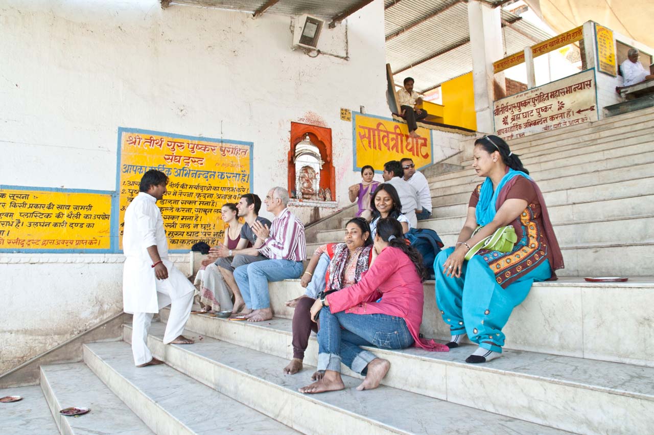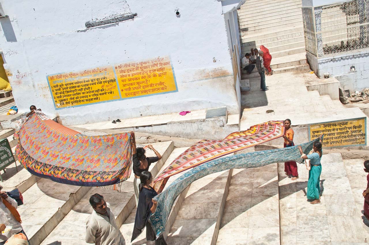 We paid our respect and came down. Next, we went to the main Ghat of Pushkar Lake near the temple. It was very pleasant under the shade on the stairs of the ghat. We saw people performing puja, some women washing their clothes (Sad) and bathing, kids jumping in the water.