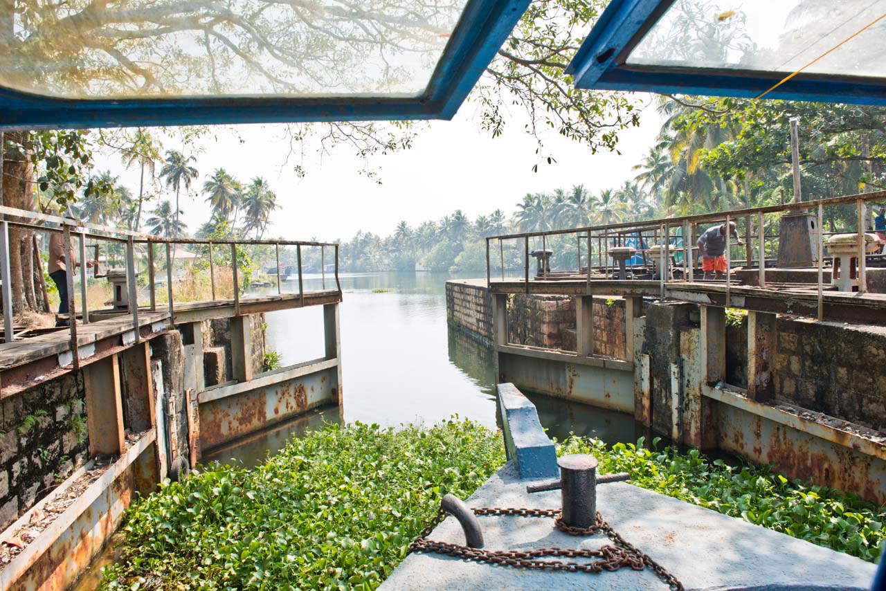 After lunch, we boarded the boat and started our onward journey. The boat then entered Thottappally where a huge spillway is constructed in between the lake and the sea to regulate the water flow between Lake and the Arabian Sea. There were two gates, which were manually opened by a man and our boat entered the Arabian sea. The backwaters are slightly lower than the sea in this area that’s why these gates were made to control the flow of water from one direction to another.
