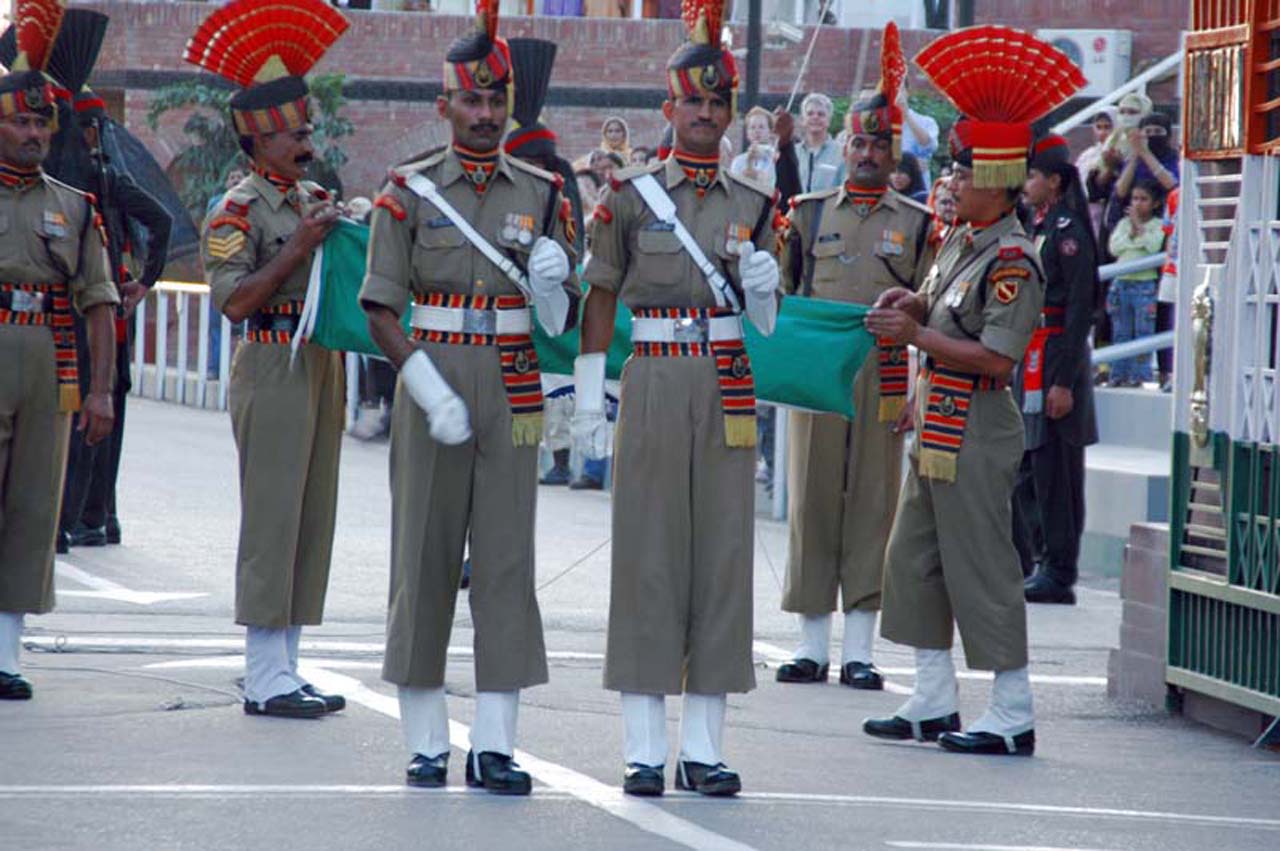 Soldiers marched on the road with hard foot stomping and after some time, both sides opened the gates with attitude. BSF soldiers started the flag lowering and the crowd cheered in full volume. Both sides lower the flags in coordination with hard foot stomping.