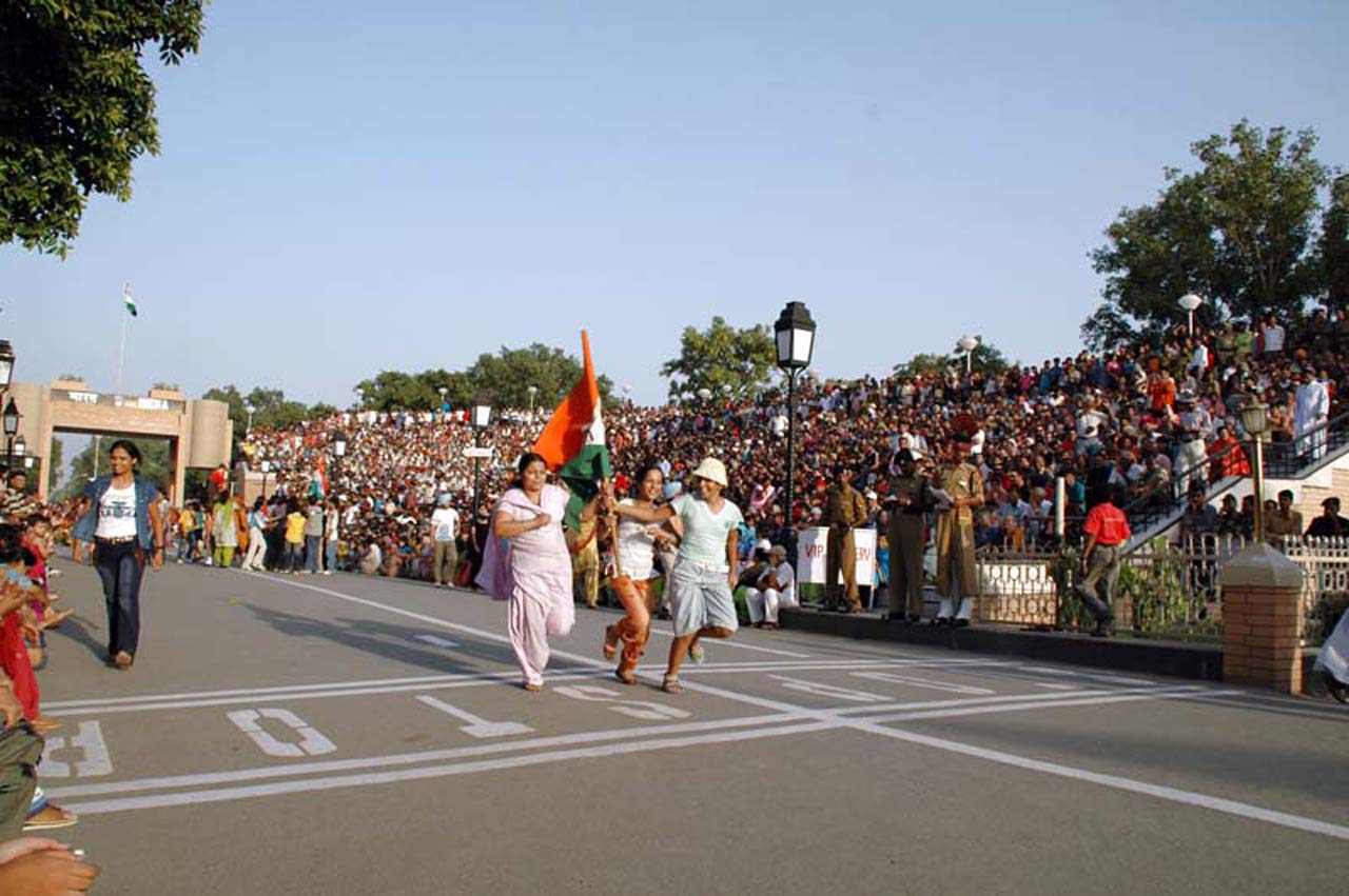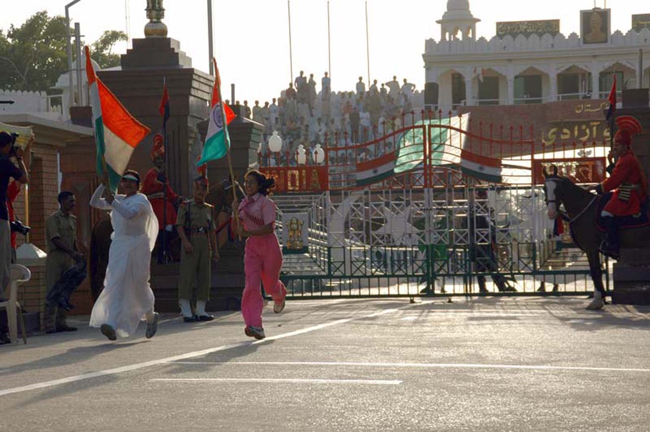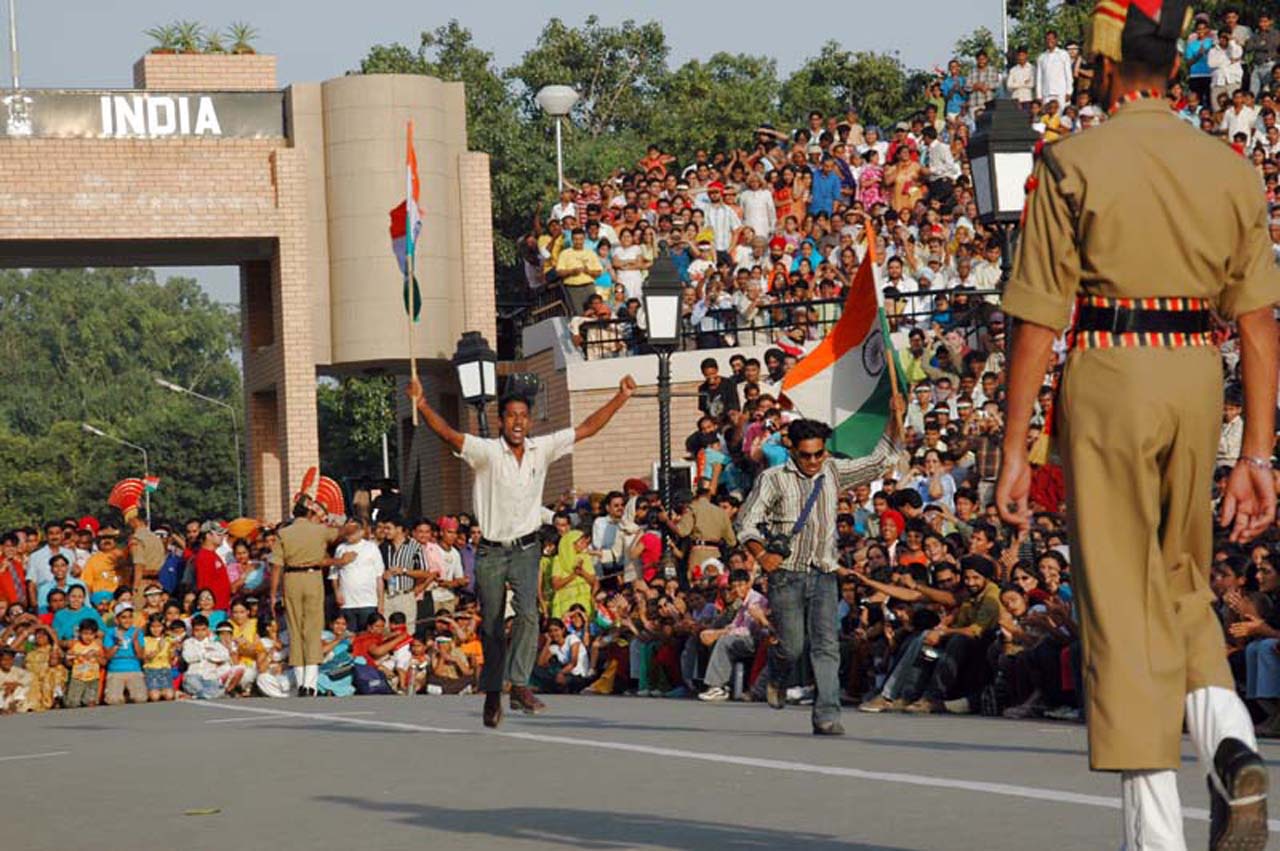 Before the start of the actual ceremony by the BSF soldiers, they play patriotic songs on loudspeakers and encourage common people to participate in it. Anyone from the crowd can participate during my visit, I saw people running with flags or dancing on the road. In a half, an hour’s time atmosphere got charged up with electric energy.