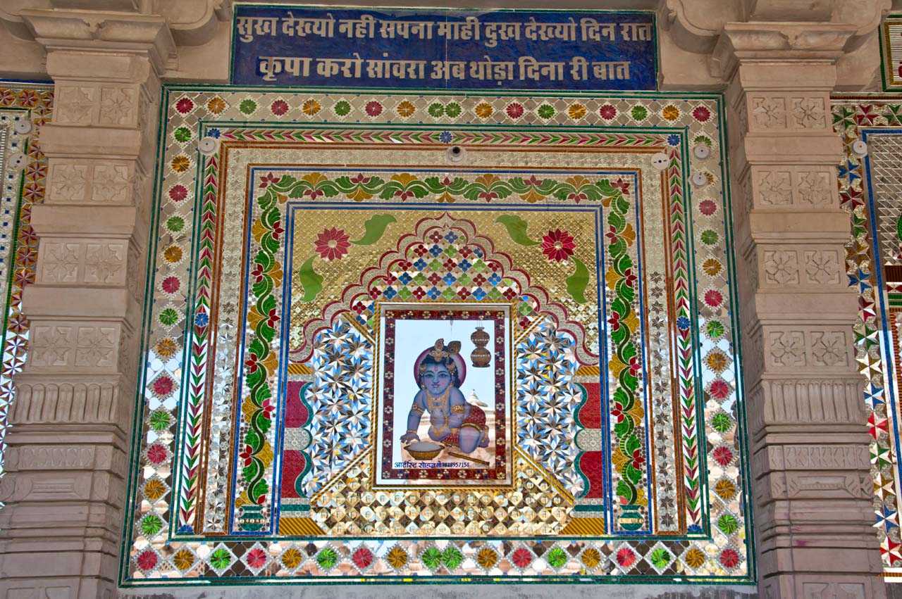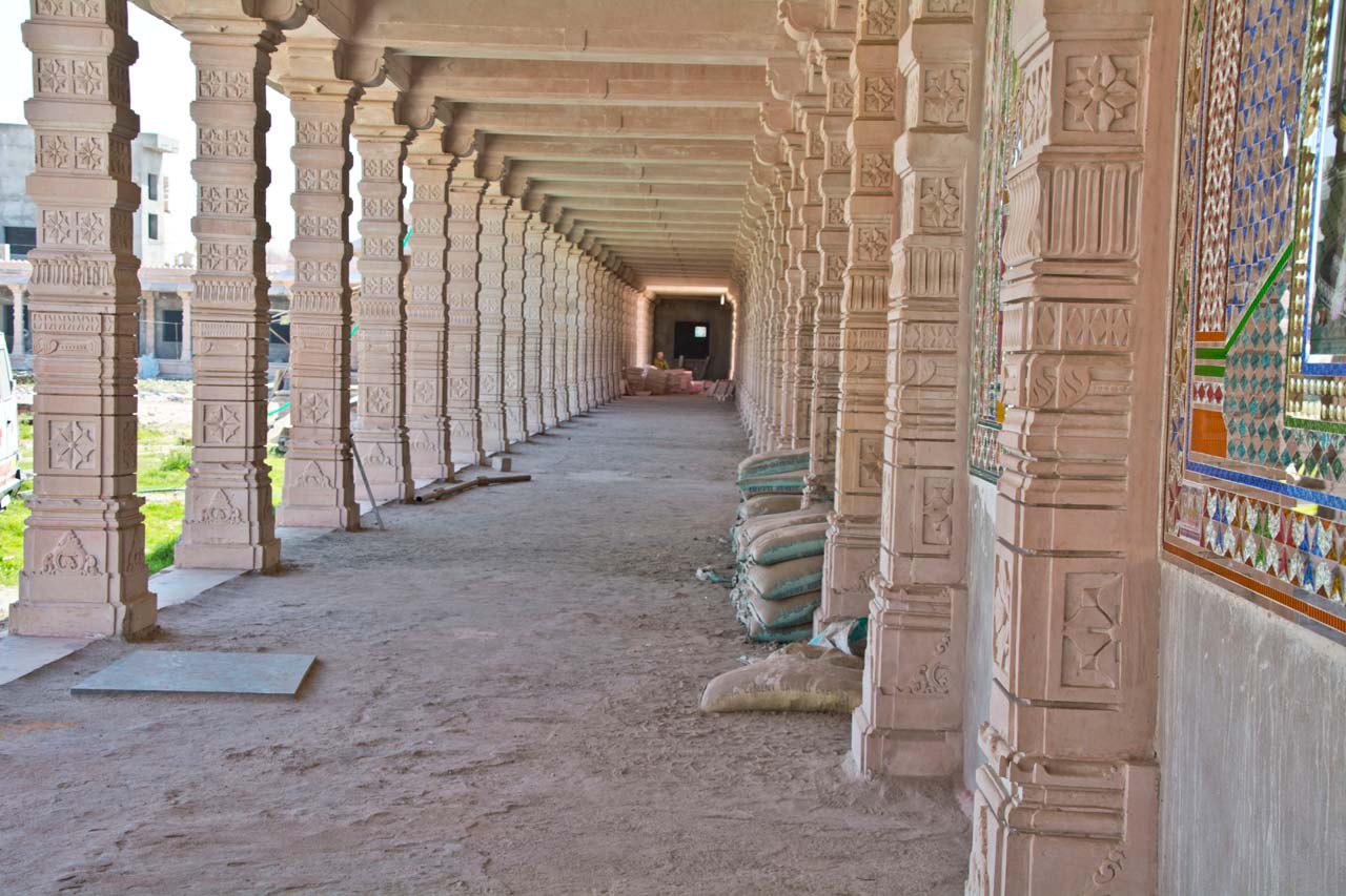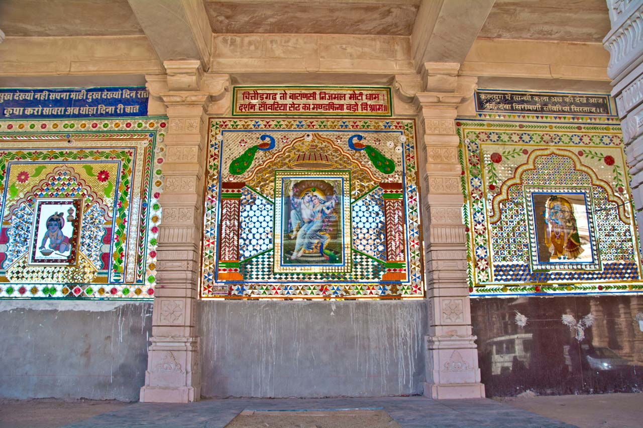 The temple is located on the Chittorgarh β Udaipur road. We negotiated with an auto rickshaw for round trip. The road to the temple was good and there were farms with crops on both sides of the road. The temple is close to the main road. As we entered the temple complex, I noticed that it was under renovation and expansion. They were installing stones & decorating the corridors. The decoration work involved the making pictures of gods and goddess with different colors of glass.