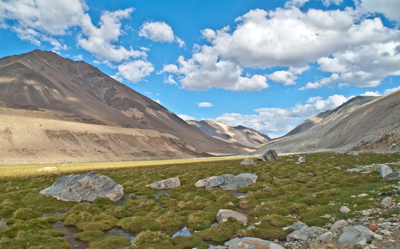 We filled our stomach and continued our drive from Leh to Pangong Lake. After driving for some time, we reached the grassland area. There was greenery on both sides of road touching the rugged hills. Our driver stopped the car in the middle of nowhere after that couple of other cars stopped behind us.