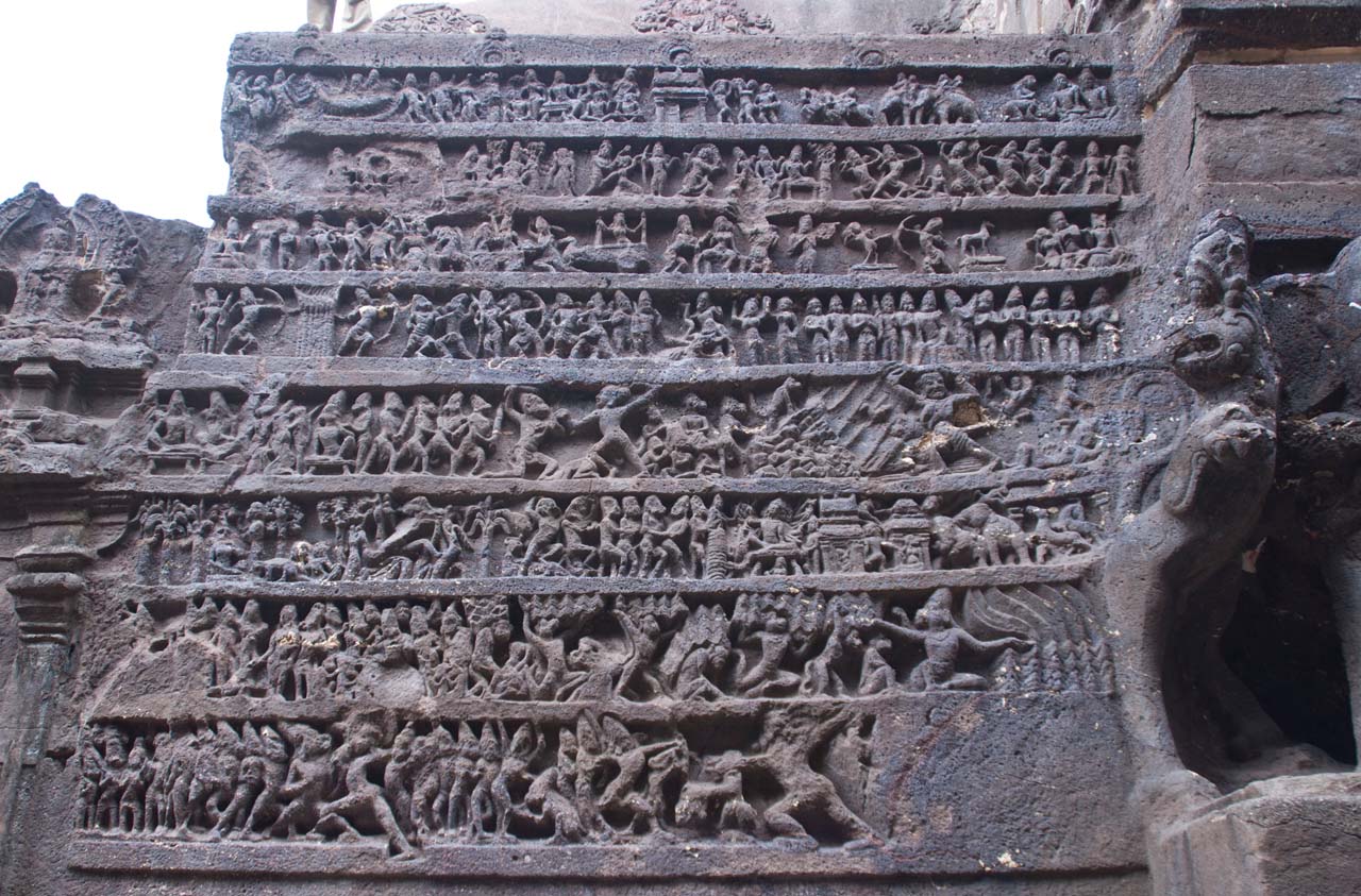 In one sculpture Ravana trying to shake Mount Kailasha and Shiva pressing Ravana into the cavern of the mountain with his feet.