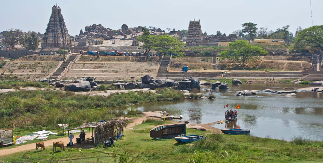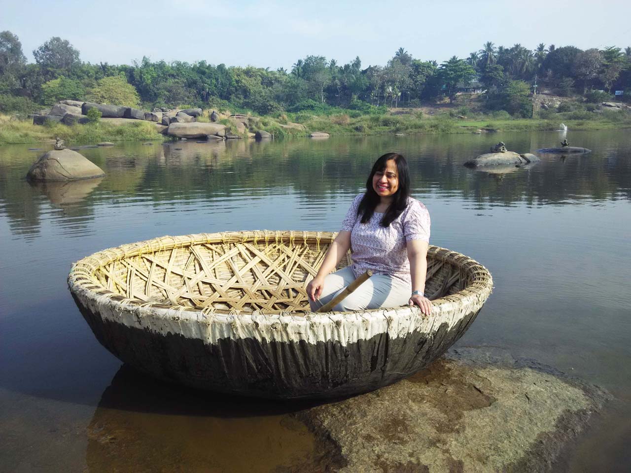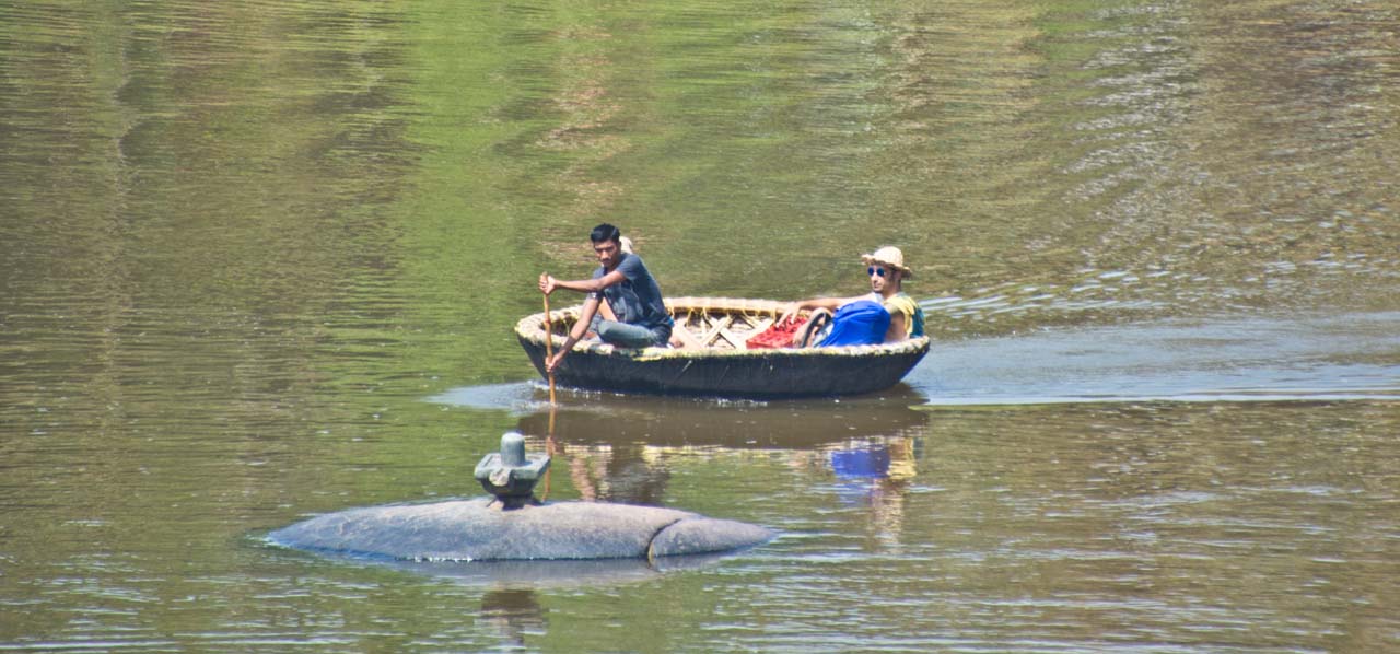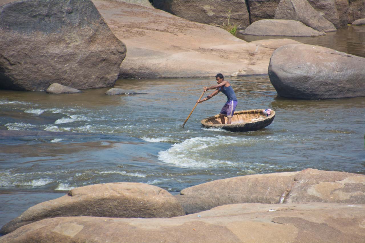 We walked for 8-10 minutes and reached the ferry point at the Tungabhadra river. There are two ways to cross the river, one by Coracle or the second by shared boat with the engine.