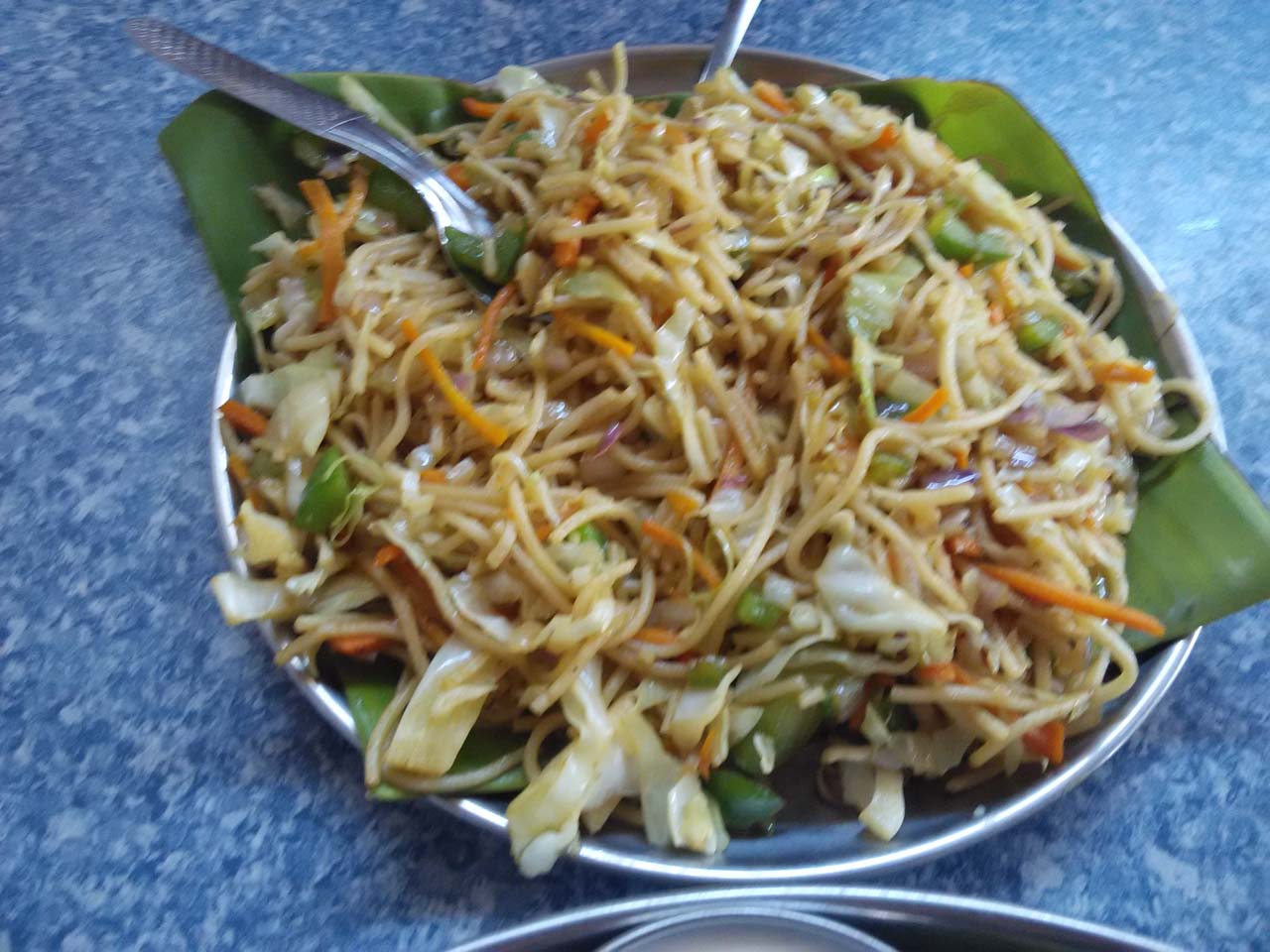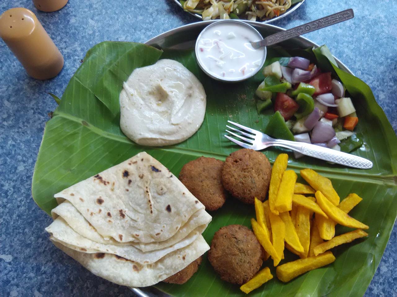 I and my friend thought of trying some other place for lunch but after checking a few places, we again went back to the Mango tree. We ordered falafel and noodles, they served those also on banana leaves.