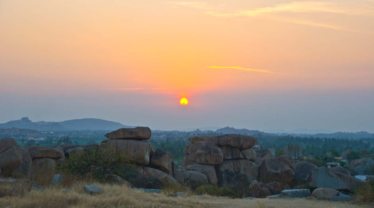 We went to the sunset point where I went earlier that day. It is on a small hill next to the Virupaksha temple. When we reached the top it was quiet and there was not a single soul only a few monkeys were running and jumping on ruins. But as sunset time approached, the place filled with people. The sunset behind the hills was beautiful.