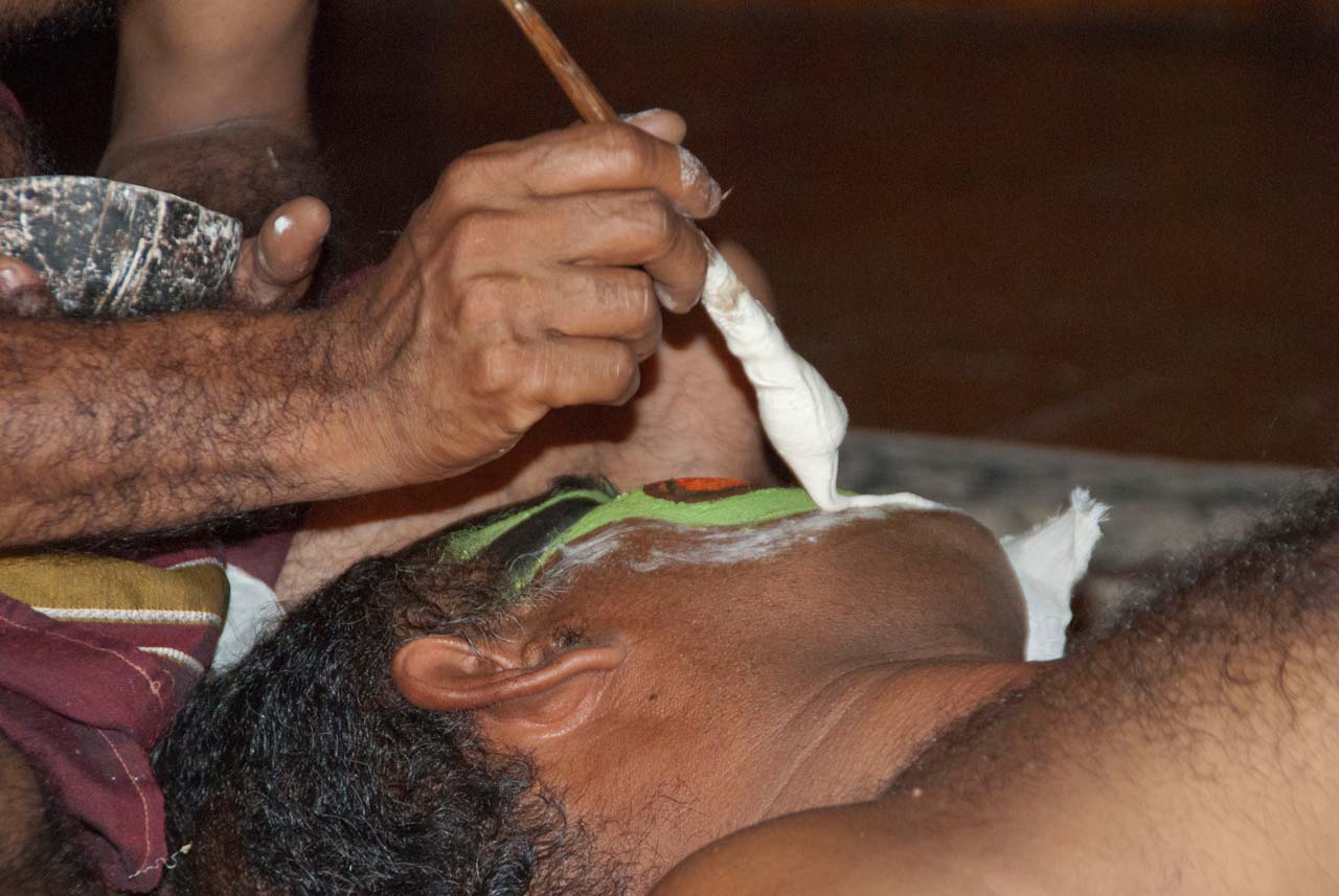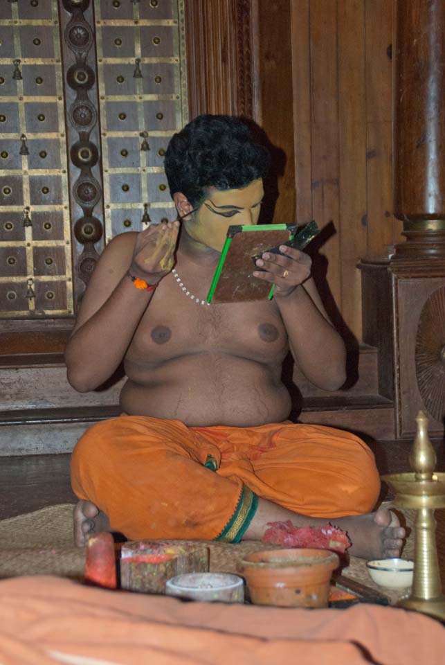 I had seen in photographs and TV programs that most of the artists have red eyes and it was a mystery for me. During the makeup, I have seen that they put a small seed inside their lower eyelid and eyes get red due to this. After makeup, they dress in traditional costumes and started performce.