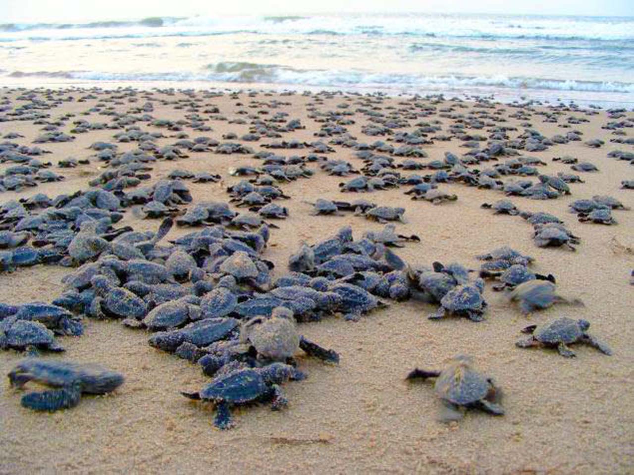 Every year from mid to end February Olive Ridley turtles come to Gahirmatha beach in Odisha’s Kendrapara district near the mouth of rivers Rushikulya to lay the eggs on the beach. The egg laying process lasts for 5-7 days during time turtles dug a flask shape pit and lay eggs. The eggs hatch in these pits for approx 50-60 days.