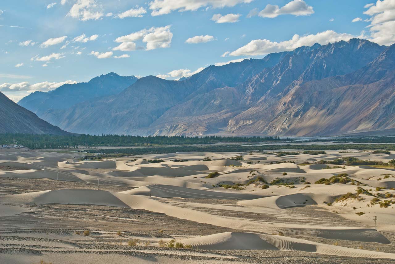 The drive through the mountains and passes is scenic. Nubra Valley is most fertile in Ladakh but at the same time, there are Hundar sand dunes. These sand dunes are highest in the world and home to double hump camels. The snow capped mountains and sand dunes create a beautiful landscape.