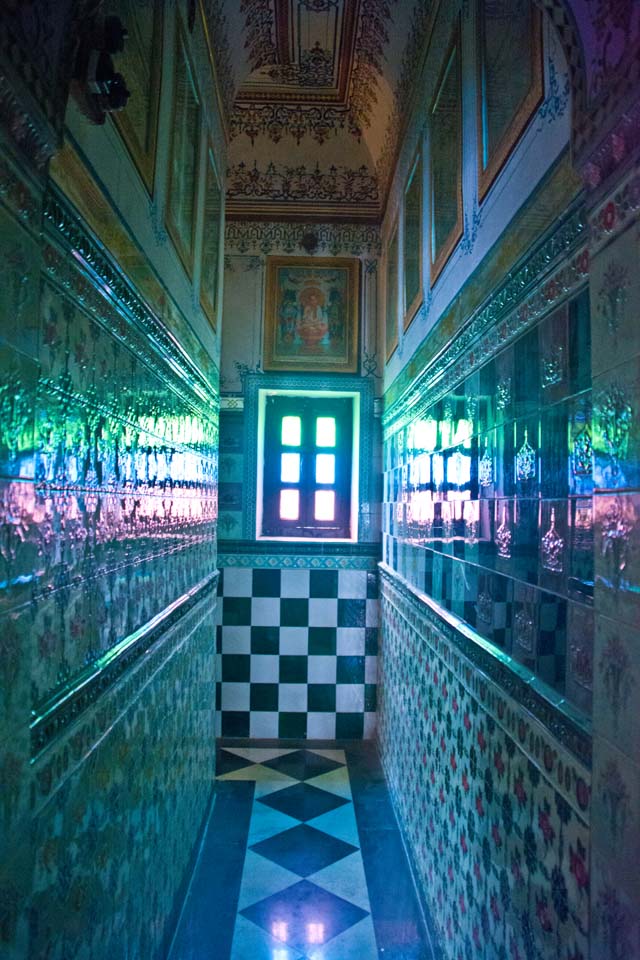In middle of the Nawalgarh town was an old haveli in which the occupants of haveli had done lots of construction and it was nothing like its old structure. In this building, they have kept one round room intact, which was decorated with thousands of colorful mirrors on its walls and roofs. It shows the beautiful designs of modern cities on its roof.